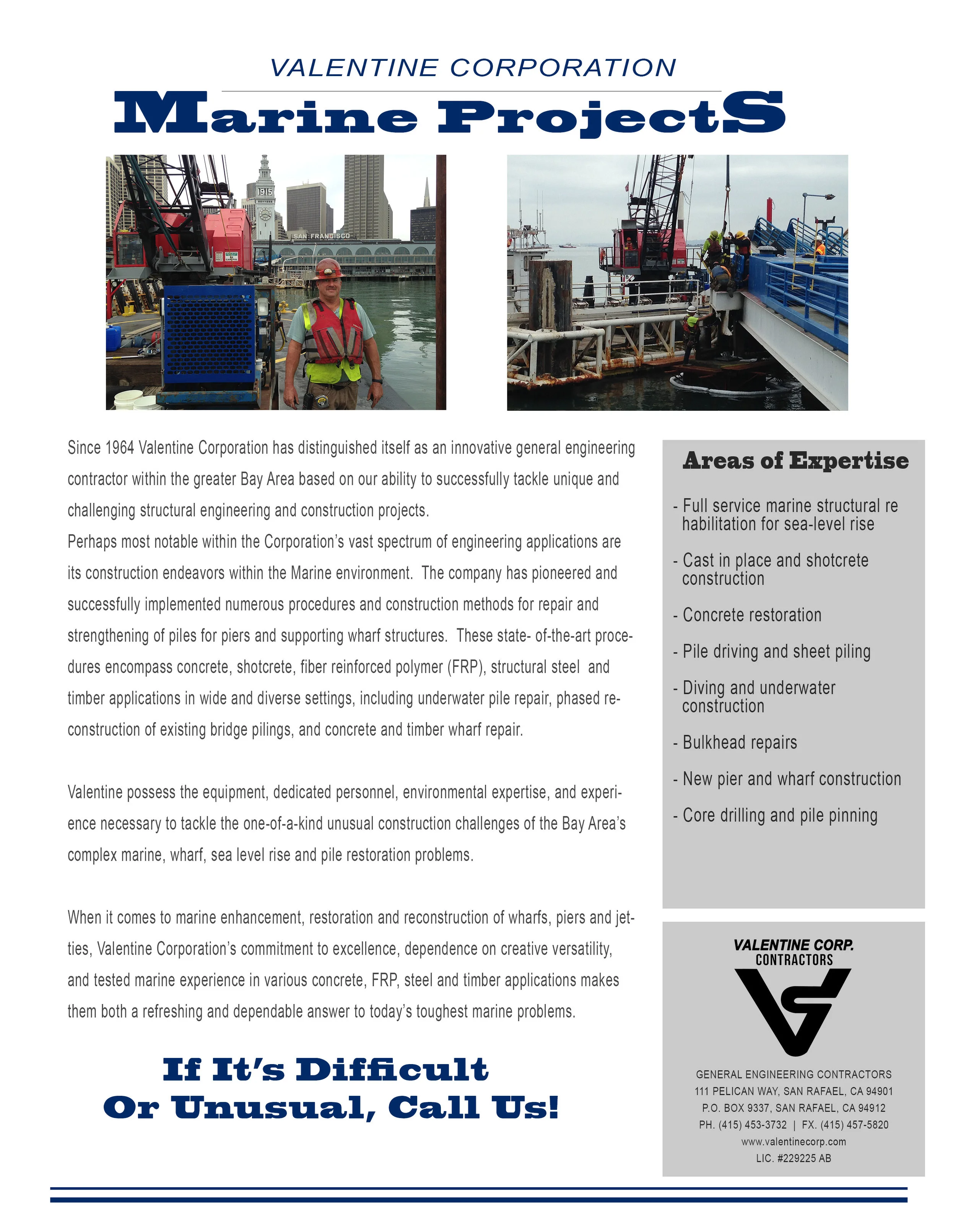 Valentine possess the equipment, dedicated personnel, environmental expertise, and experience necessary to tackle the one-of-a-kind unusual construction challenges of the Bay Area’s complex marine, wharf, sea level rise and pile restoration problems.