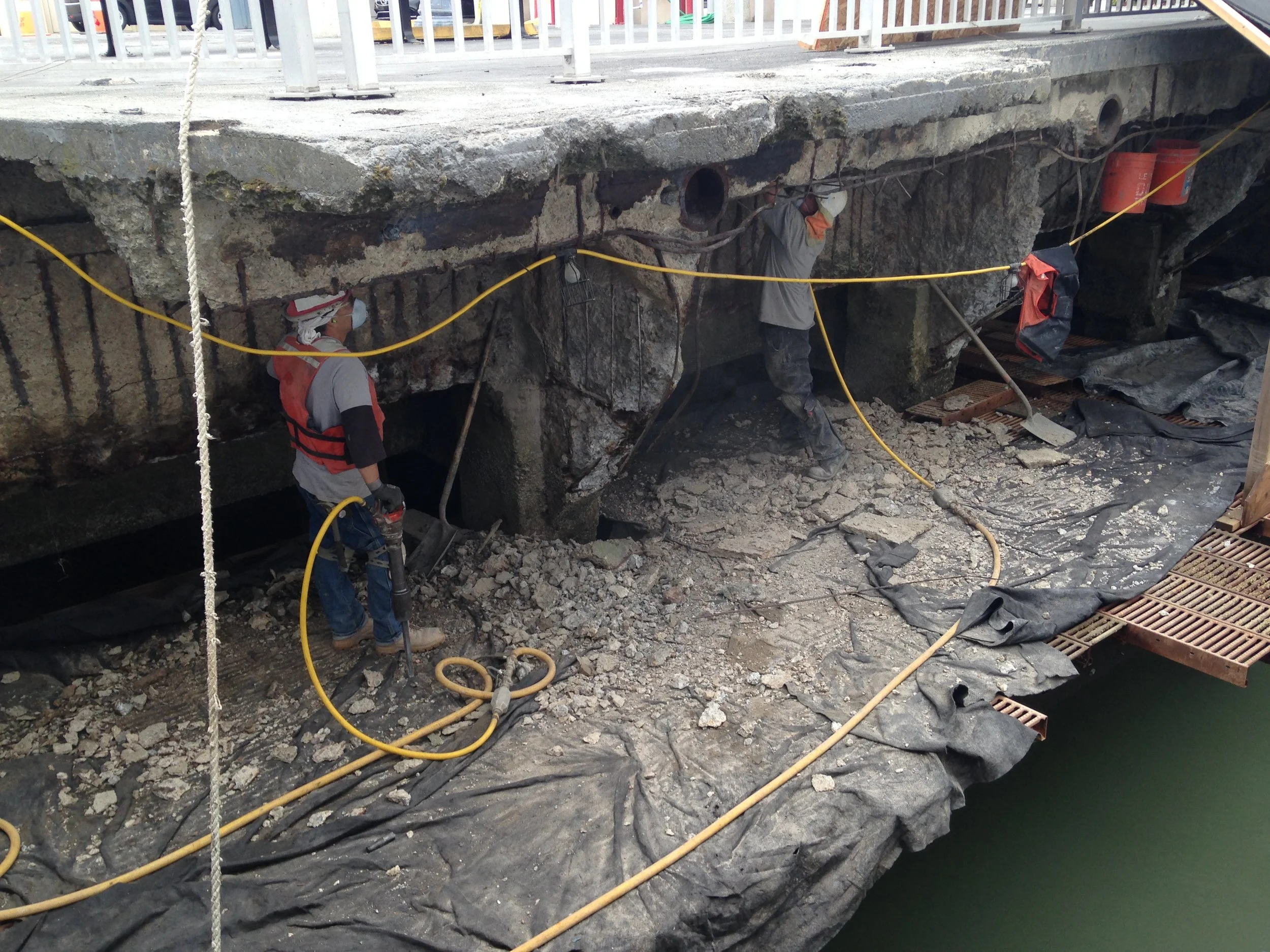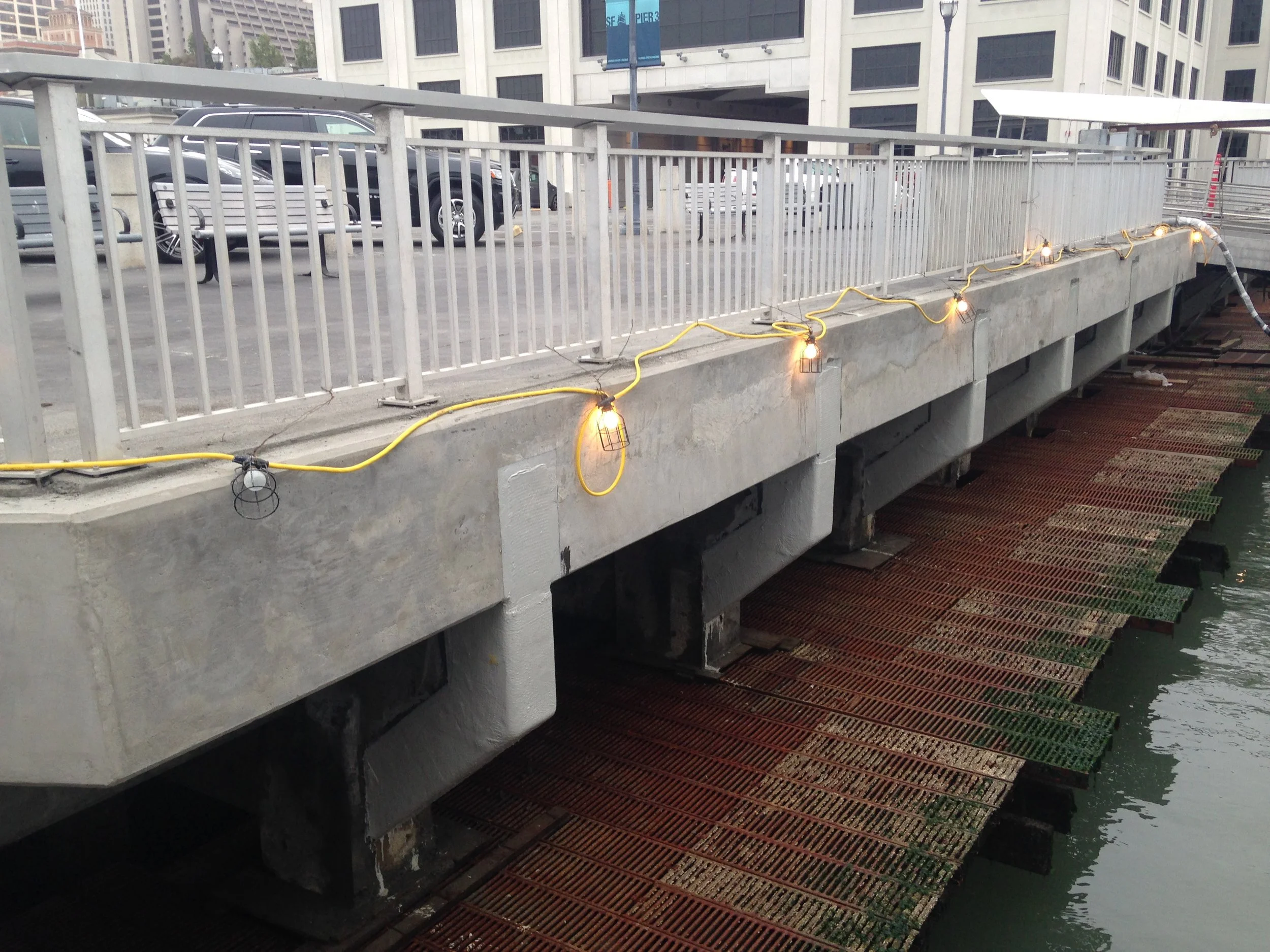 Work entailed concrete restoration on the SF Hornblower Yachts pier 3 that is on the National Register of Historic places. Restoration work focused on removal of deteriorated concrete and rebar and rebuilding the substructure elements. A composite wrap was also used to strengthen and restore the load carrying capability of the Pier.